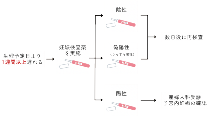 月経周期が28日間の方であれば、次の生理予定日頃、すなわち妊娠4週頃から市販の妊娠検査薬が陽性となります。生理の周期や排卵日は人によって違うため、生理が1週間以上遅れている場合には、妊娠検査薬で妊娠反応を確認しましょう。