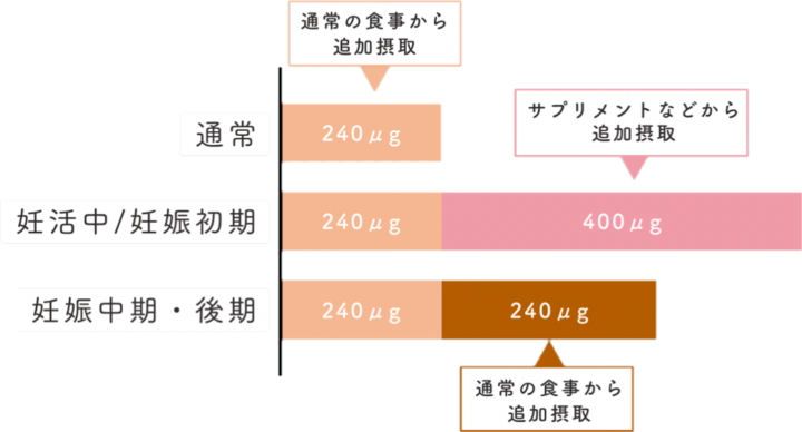 胎児の体を作るのに必要な葉酸量を女性の体に蓄えるのに、毎日葉酸を400㎍摂取して約1か月半、800㎍摂取しても約1か月かかることがわかっています。遅くとも妊娠1か月前には摂取推奨量をキープすることが望ましいでしょう。