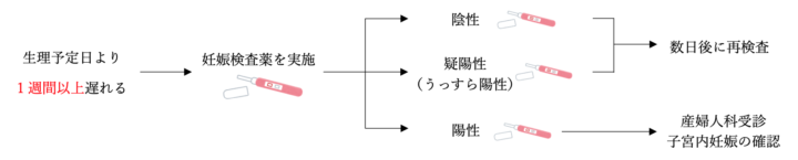 生理が来ないときは、生理予定日を1週間過ぎた頃に妊娠検査薬を使用してみましょう。生理予定日すぐだと、妊娠検査薬が正しく反応しない場合があります。妊娠検査薬で陽性判定が出たら、産婦人科に受診しましょう。